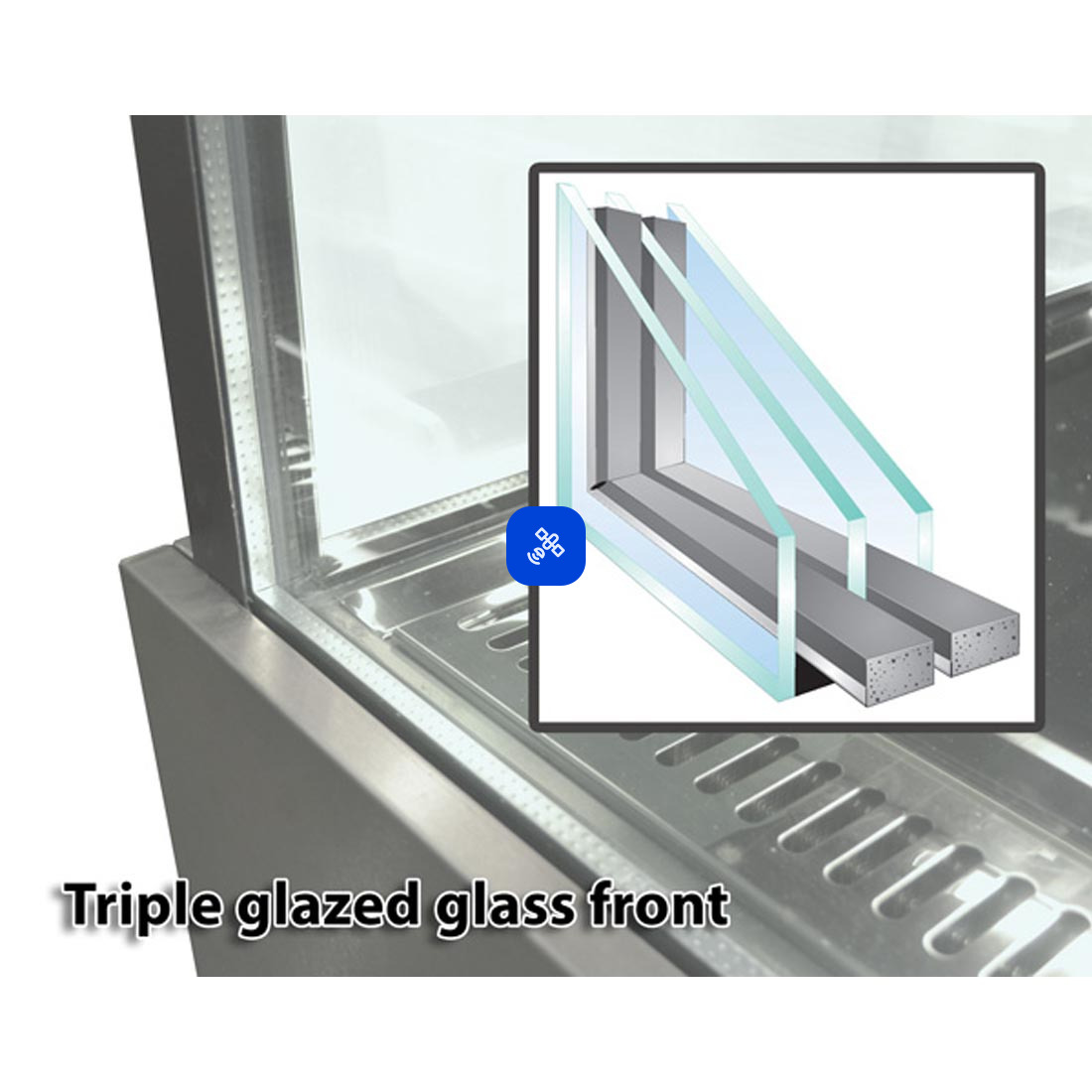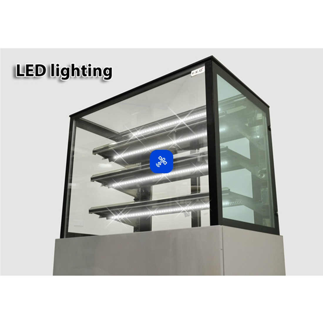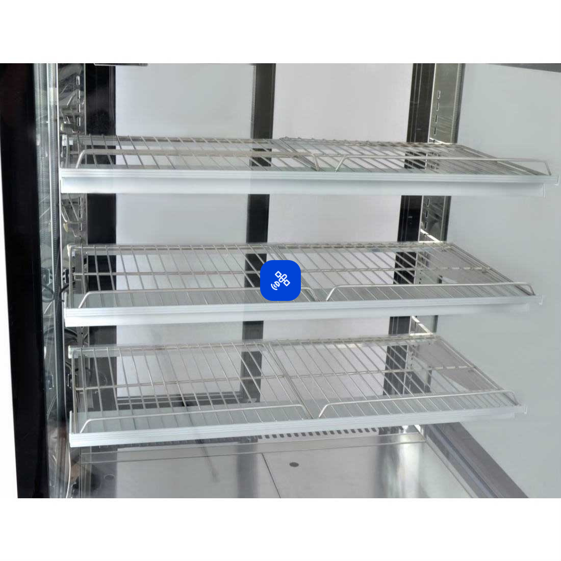 This deluxe cake display has three adjustable shelves, powerful secop compressors for functionality, a stainless-steel frame for sturdiness, LED lighting to ease interior viewing, digital temperature control and a triple glazed front with heated filaments