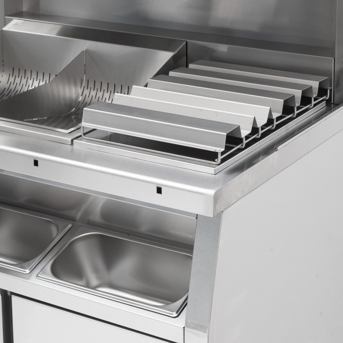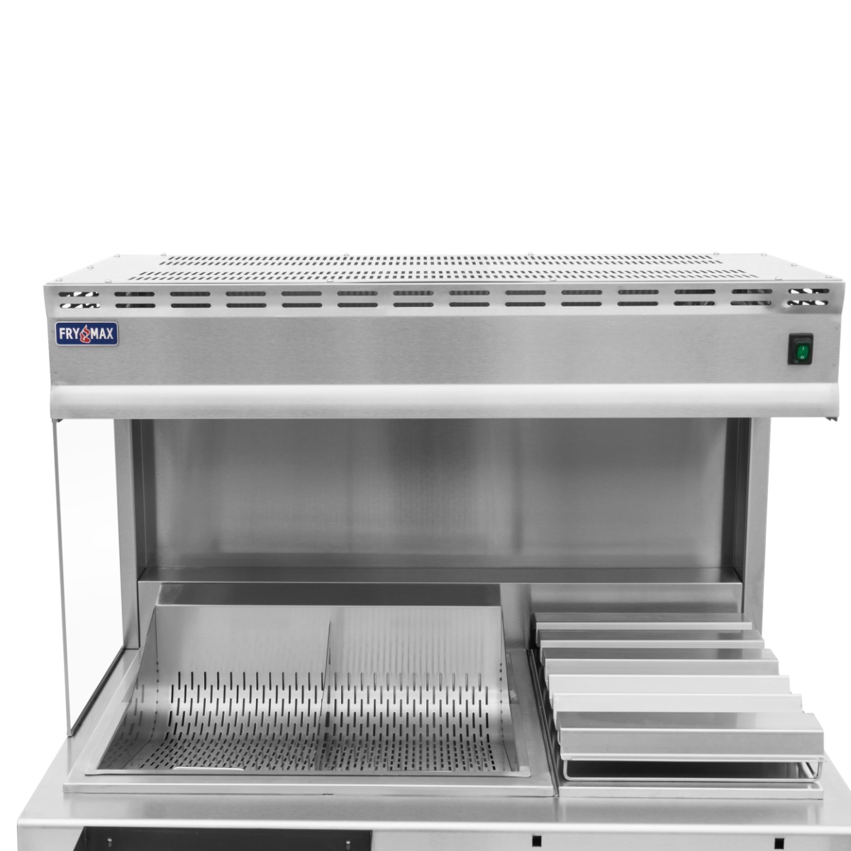 - Comes with front stainless steel box and 2x 1/3 and 1x 1/6 150mm deep GN pans