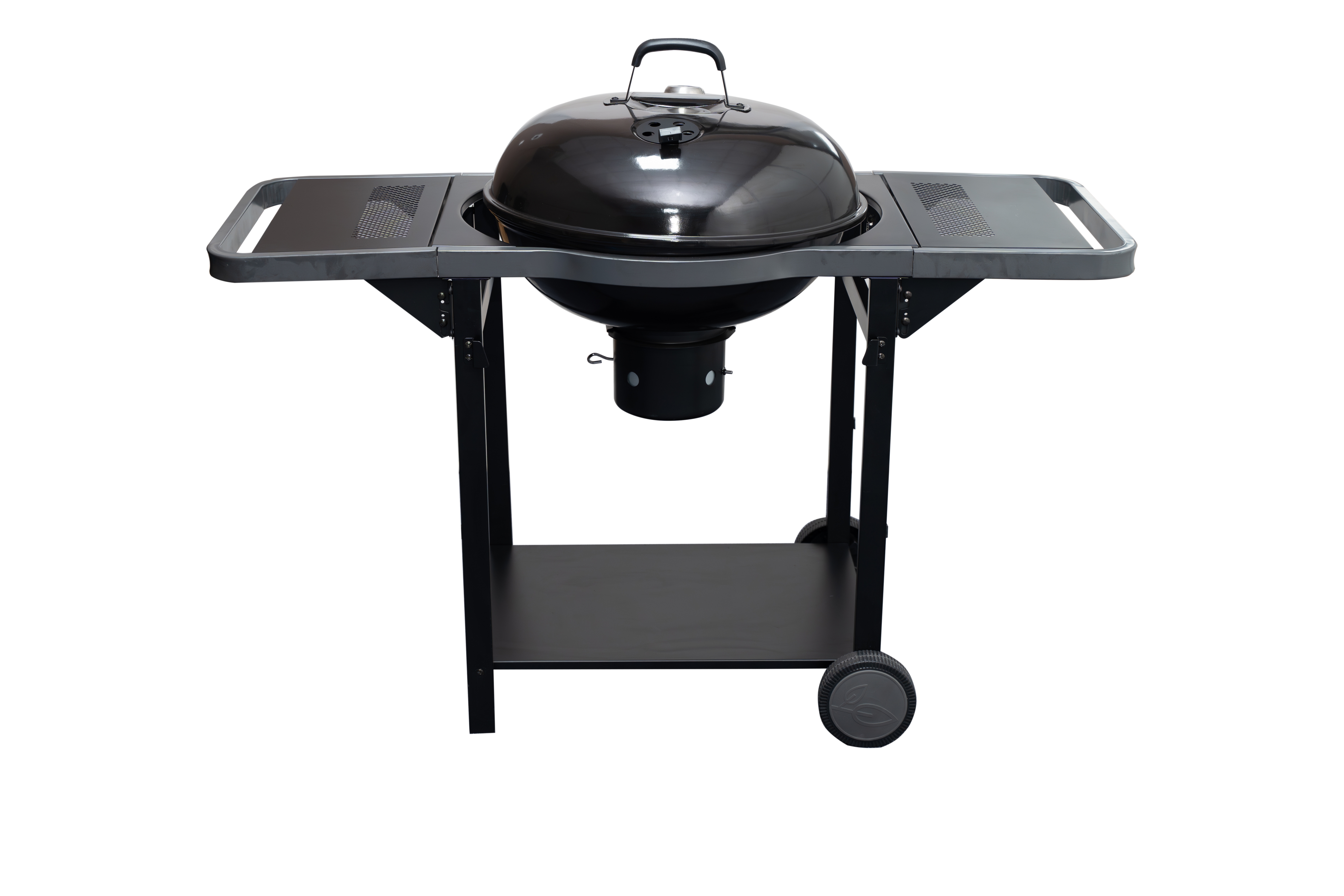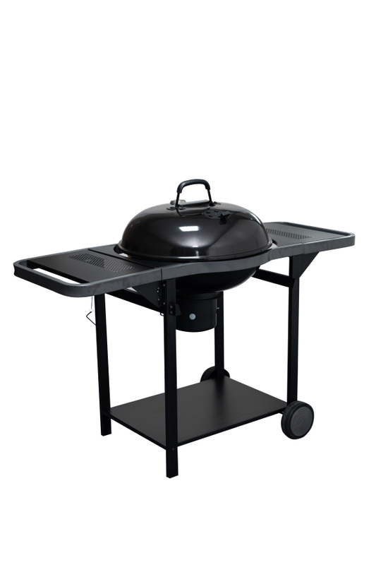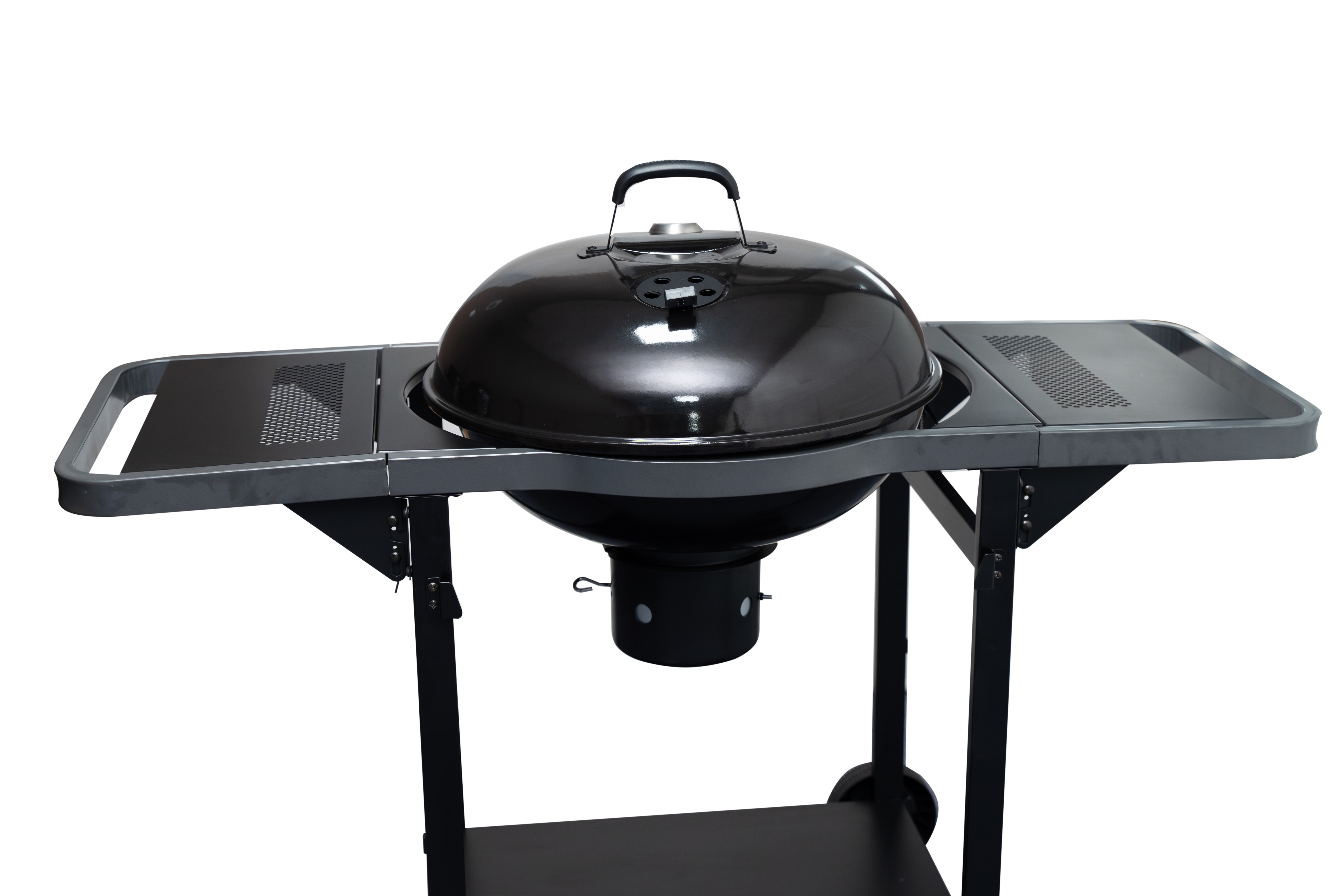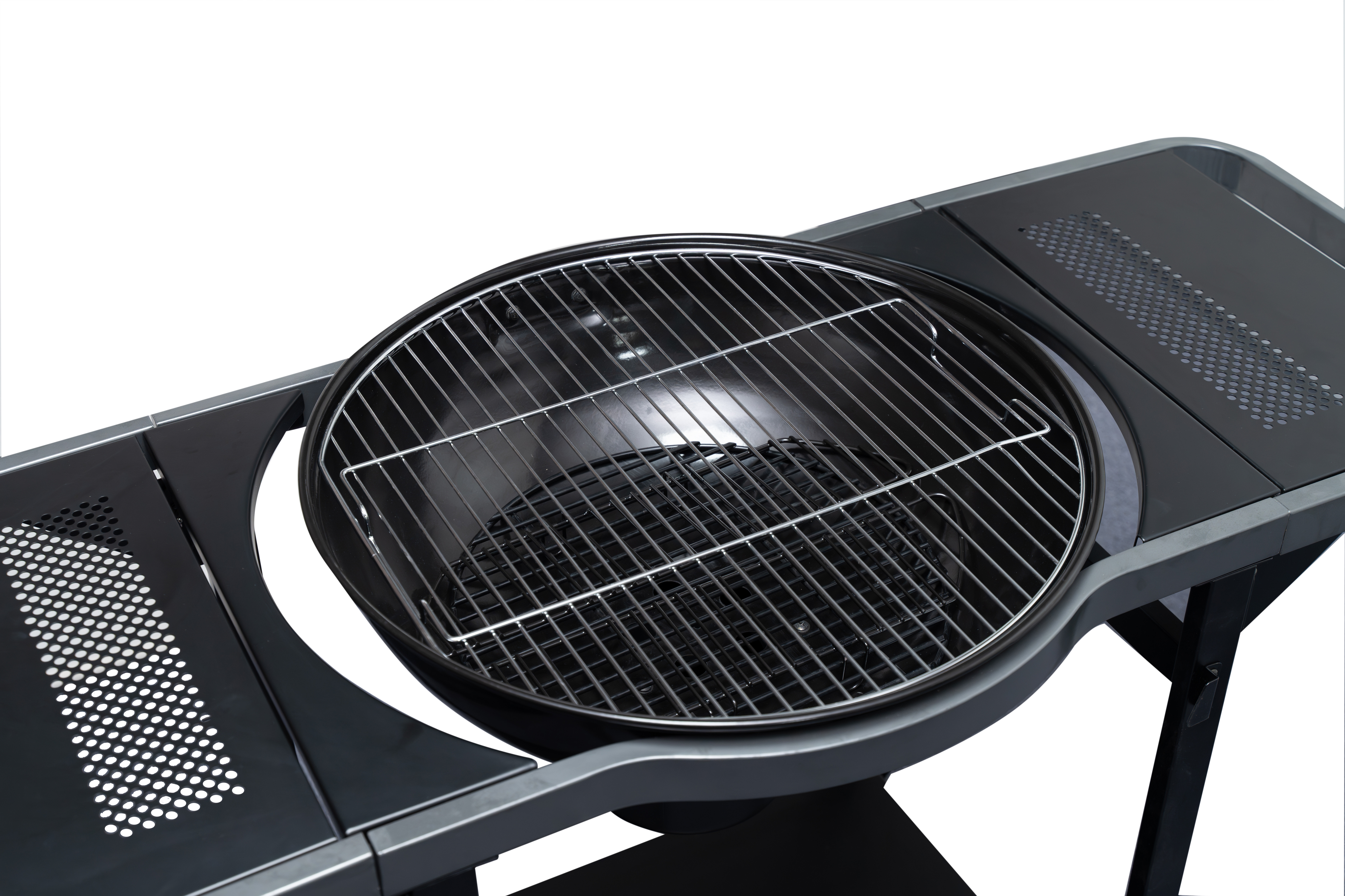 *Enamelled steel hearth on trolley with metal basket, lateral shelf and enamelled cover.